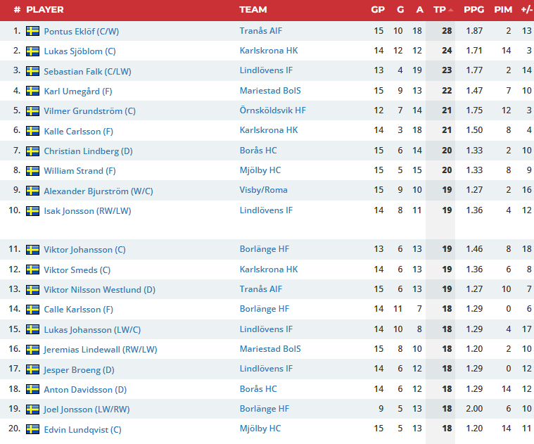 - Pontus Eklöf står för 2+2 idag och tar över ledningen av poängligan med det. Att han fortsätter leverera är en överlevnadsstrategi för Tranås, men det kan inte fortsätta vara på det sättet i all evighet. Högst poängsnitt per match bland de som spelat tio eller fler matcher (1,87)